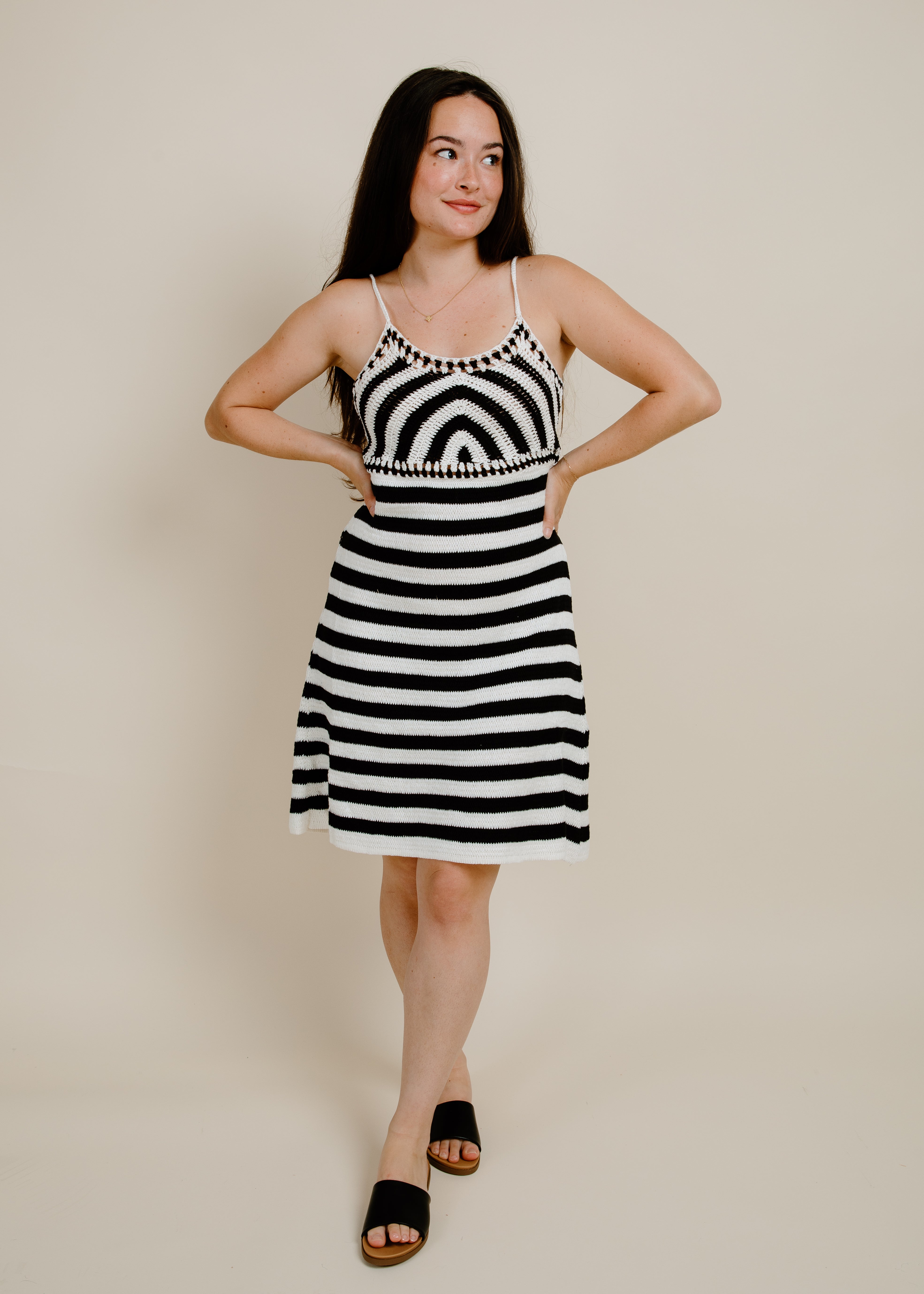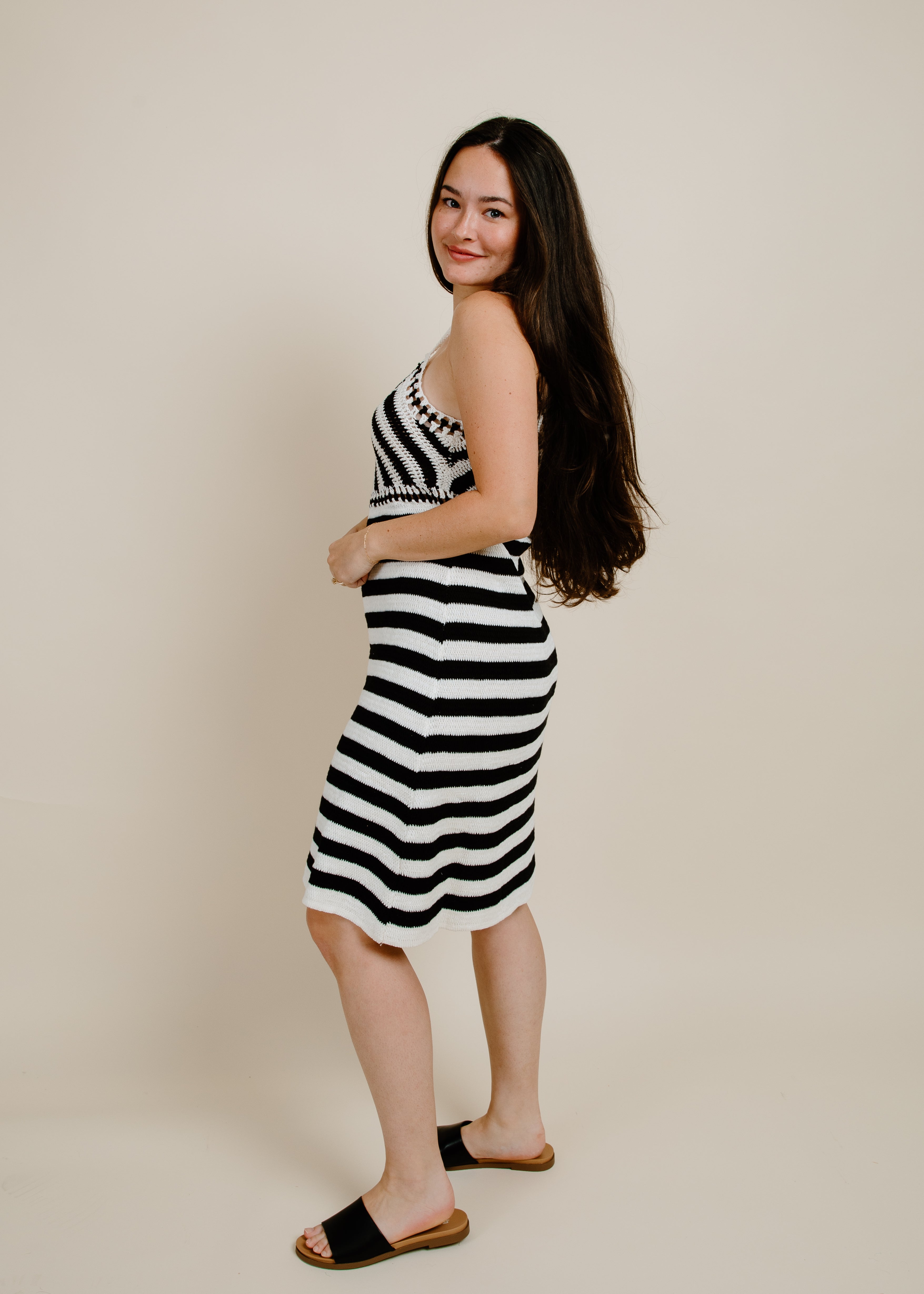 Wild At Heart is this dress! This vacation-ready piece features a unique combination of stripes and crochet design, making it perfect for a day at the beach or a night out. Embrace your playful side with this lightweight, bold midi dress.