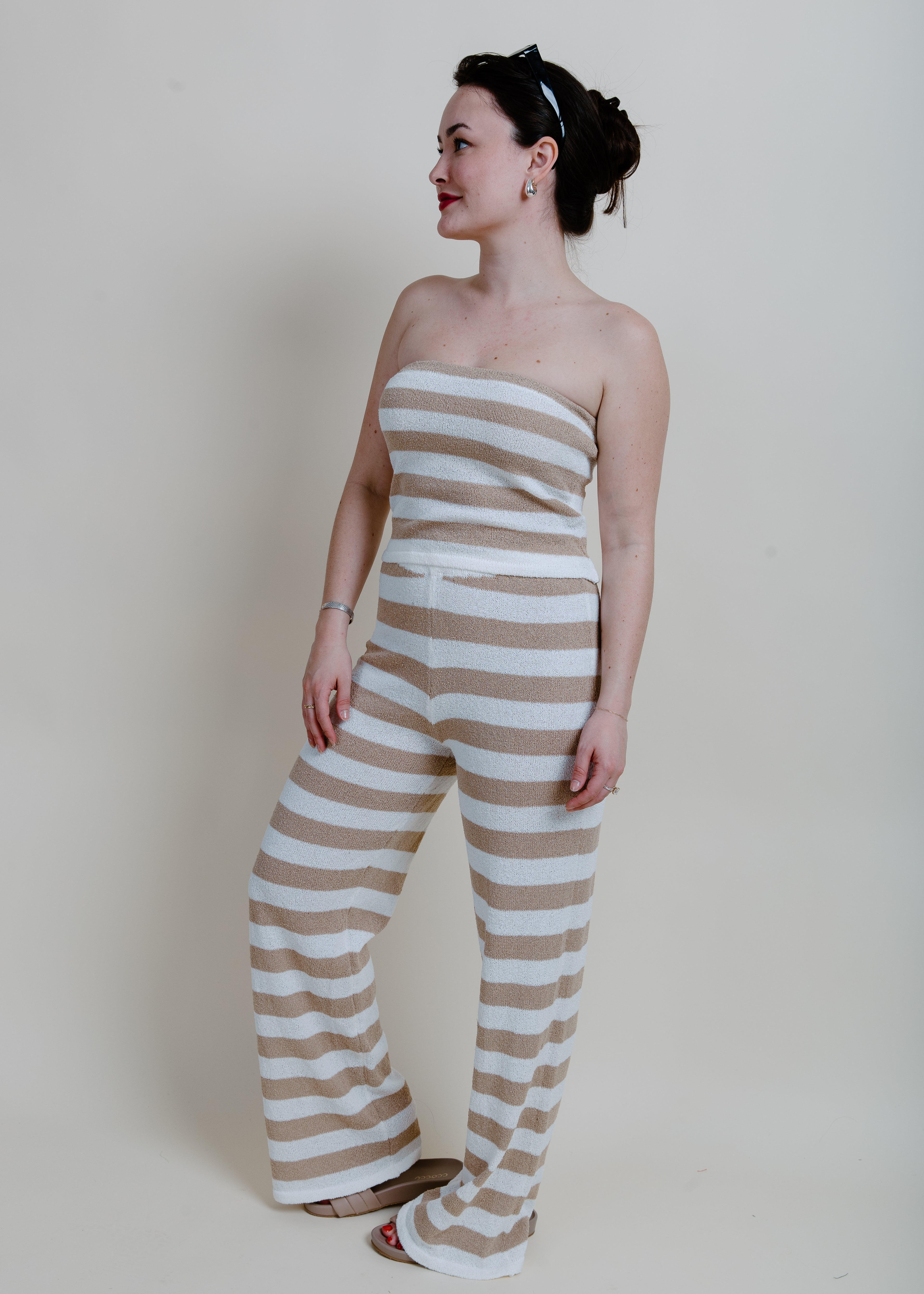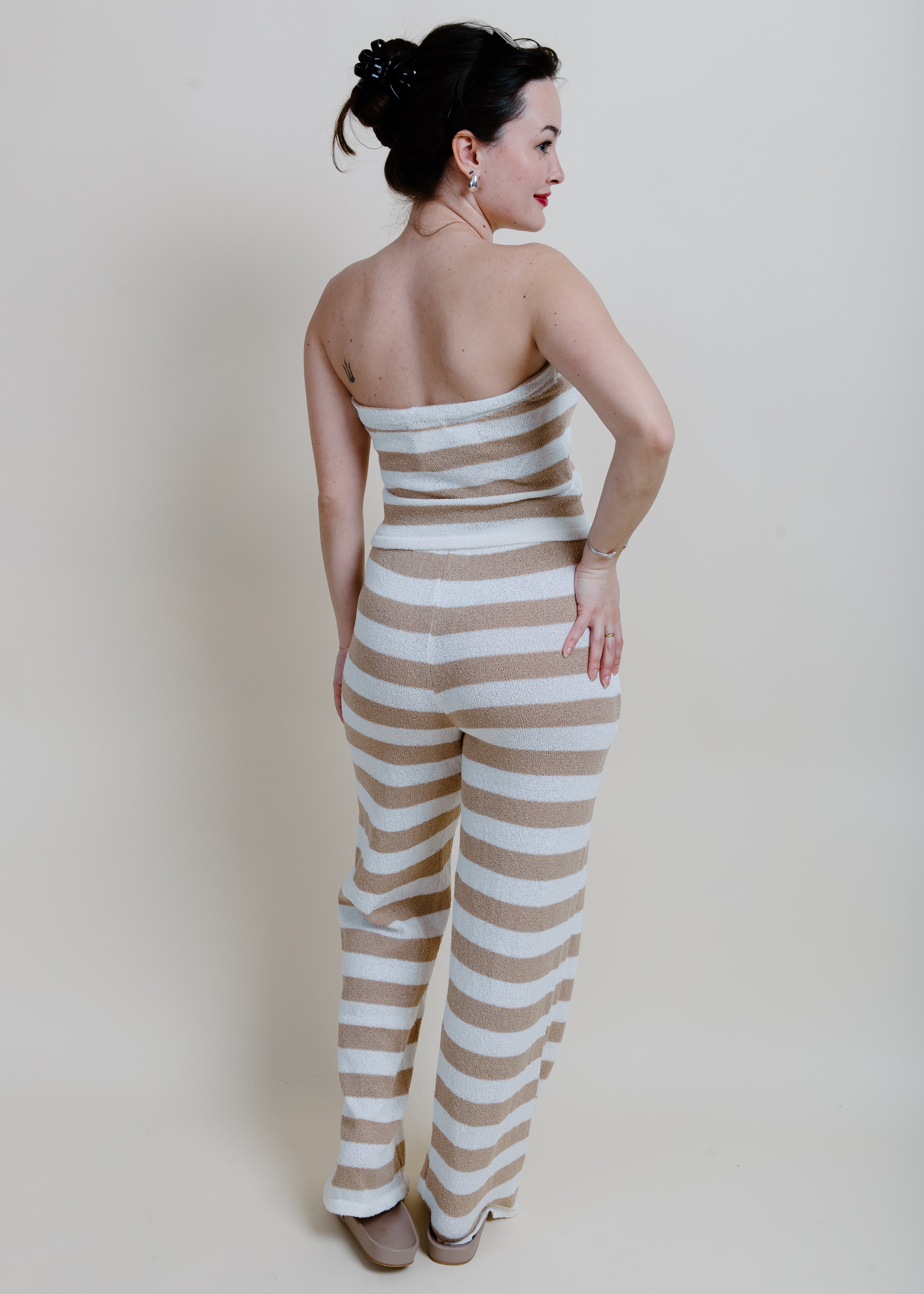 Our Lake Lounge Striped Set features a textured striped tube top and matching pants with an elastic waistband in a beige-ivory combo. You can never have too many comfy sets, right?